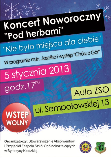 W dn. 05.01.2013 r. odbył się w naszej szkole NOWOROCZNY KONCERT "POD HERBAMI". Został on zorganizowany z inicjatywy Stowarzyszenia Absolwentów i Przyjaciół Zespołu Szkół Ogólnokształcących w Bystrzycy Kłodzkiej. W ramach koncertu młodzież z klasy II b liceum wystawiła jasełka. W części muzycznej wystąpił "CHÓR Z GÓR" oraz młodzież licealna i gimnazjalna. Na zakończenie było wspólne śpiewanie kolęd. Po koncercie wszyscy uraczyli się pysznym ciastem. Dziękujemy serdecznie wszystkim, którzy przyczynili się do tego, aby to wydarzenie mogło mieć miejsce.