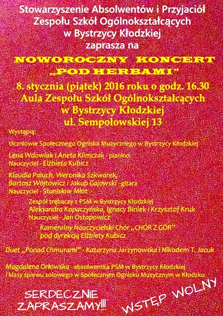 09.01.2015 odbył się coroczny KONCERT "POD HERBAMI". Został on zorganizowany z inicjatywy Stowarzyszenia. Wystąpili: Emilia Rzeszutek i Aneta Klimczak - uczennice Społecznego Ogniska Muzycznego w Bystrzycy Kłodzkiej przygotowane przez Elżbietę Kubicz, Międzynarodowy Kameralny Nauczycielski Chór "CHÓR Z GÓR" i duet "PONAD CHMURAMI".